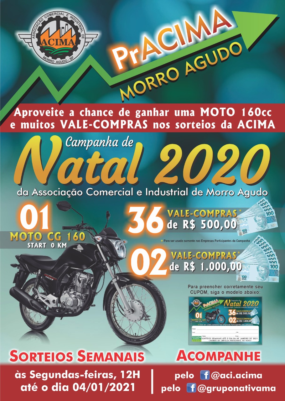 Haverá sorteios semanais de vale-compras, totalizando R$ 20 mil em dinheiro. Os vales-compras serão para serem gastos nas lojas participantes da promoção. Serão quatro sorteios de 500 reais durante 9 semanas seguidas. Os cupons serão preenchidos a cada semana. Depois do sorteio, os cupons serão armazenados para o sorteio final que será realizado dia 04 de Janeiro de 2021 com o sorteio de uma moto Honda 0 km e dois vales compras de 1 mil reais.