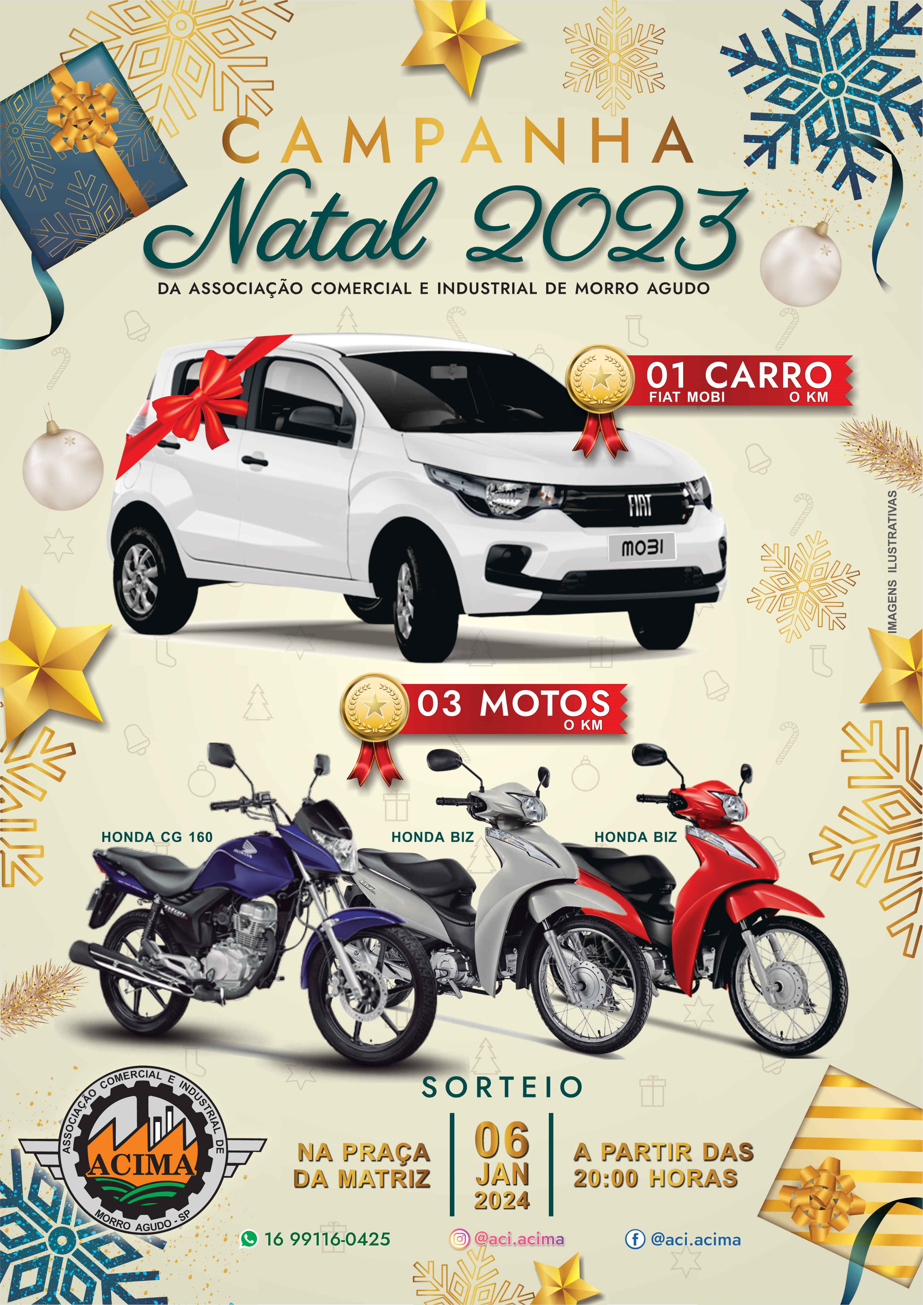 No dia 06/11 teve início a Campanha de Natal 2023 da ACIMA com a premiação de 2 Motos Honda Biz 0km, 1 Moto Honda CG 160 0km e 1 Carro Fiat Mobi 0km.