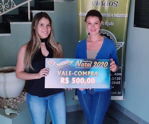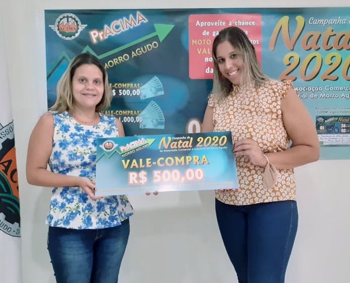 Foto: Marina Voltarelli (Secretaria da ACIMA) entregando vale-compras para Ana Carolina de Castro que comprou no E.R Cabeleireiro.
