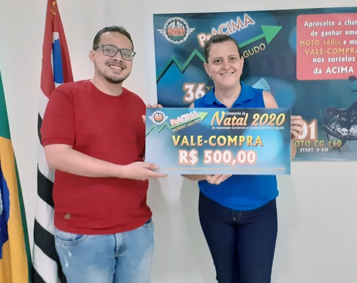 Foto: Neto Guimarães (Auxiliar Executivo da ACIMA) entregando vale-compras para Edma Cristina Alves Medeiros que comprou no Supermercado Chaim.