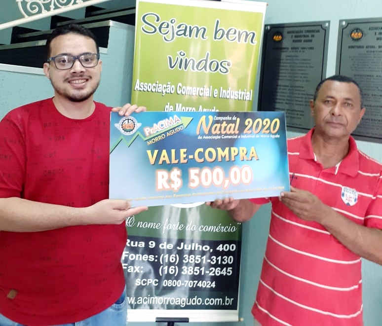 Foto: Neto Guimarães (Auxiliar Executivo da ACIMA) entregando vale-compras para Adonias Ataides dos Santos que comprou na Eletrozema.