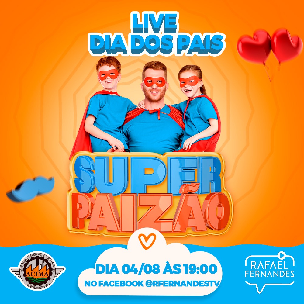Nesta Quarta-Feira 04 de Agosto a partir fas 19:00h vai acontecer a Super Live do Dia dos Pais com mais de 100 lojas participantes, diversos sorteios e brindes. Com Trasnmissão ao vivo pela página do Facebook da ACIMA e Rafael fernandes TV com diversas atrações. Participe!