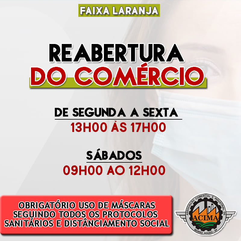 A partir de 22 de agosto de 2020, os estabelecimentos comerciais considerados não essenciais poderão funcionar no período das 13h às 17h, de segunda à sexta-feira e aos sábados das 09h às 12h.