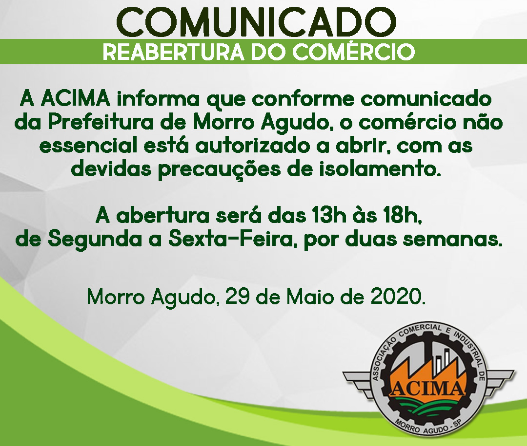 A partir do dia 01 de junho de 2020, os estabelecimentos comerciais considerados não essenciais poderão funcionar no período das 13h às 18h, de segunda à sexta-feira, mas, fiquem atentos ao decreto Estadual e Municipal e exigências das autoridades Sanitárias.